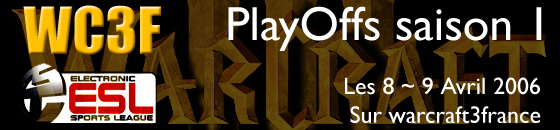 Chaud devant, l'évènement warcraftien de ce printemps 2006 est enfin arrivé! Après une saison régulière pleine de rebondissements et un niveau de jeu en constante évolution, les équipes francophones ayant participé à la première saison de la WC3F peuvent être fières d'elles. Du règlement aux horaires en passant par la régularité et la motivation générale, tous les acteurs de cette première saison ont permis à la scène francophone de retrouver ses lettres de noblesse en poussant le vice jusqu'à organiser des playoffs en lan afin de permettre aux joueurs des quatre meilleures équipes de s'affronter en live pour notre plus grand plaisir ! Des playoffs qui ont ce week-end à Paris, au cybercafe atlanteam et qui seront suivis en direct pour vous sur warcraft3france et à l'issue desquelles l'équipe championne remportera un slot pour les qualifications de la WC3L saison X !