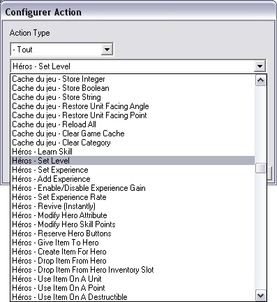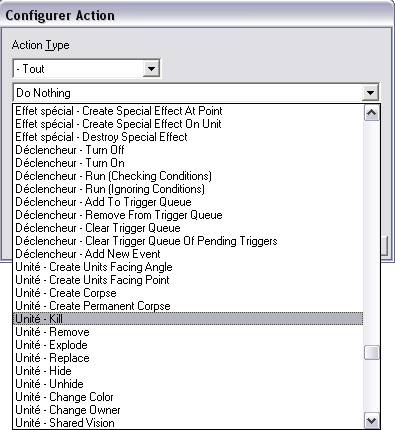 - Les actions sont tout simplement ce qu'execute le déclencheur. On trouvera dedans "Tuer telle unité", ou bien "Monter de niveau tel héros", etc... Seules les actions effectuent des actions visibles sur la map.