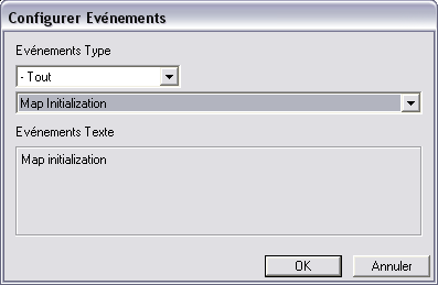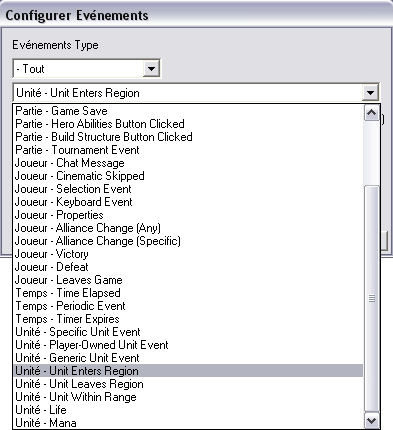 - Les évènements sont tout ce qui va déclencher le déclencheur. On pourra inclure, dans ces évènements, "si l'archimage entre dans la région 001", et plein d'autres choses comme ça