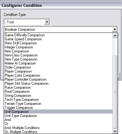 Dans le menu déroulant, il nous propose plein de types de conditions différentes (comparaisons entre des héros, des objets, etc...). Nous, ce que nous voulons, c'est comparer l'unité qui entre à l'archimage. De cette manière, si l'unité qui entre est l'archimage, le déclencheur se poursuivra normalement, tandis que si ce n'est pas l'archimage --> on stoppe tout.