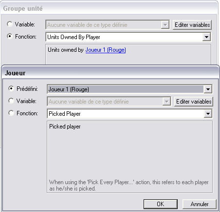 - Groupe unité - Pick every unit in (Units owned by Joueur 1 (Rouge)) and do (Actions) : Va prendre toutes les unités possédées par le joueur 1, et les mettre dans un groupe d'unités.