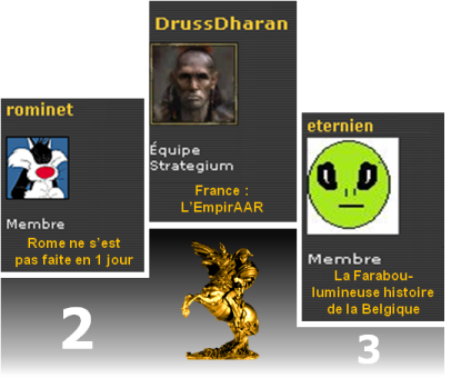 Voilà bien une catégorie où chaque nominé avait de réelles chances. Au point qu'à quelques jours de la fin du concours, les écarts étaient réduits à leur plus simple expression. Finalement, c'est votre fibre patriotique qui a parlé puisque vous avez choisit comme Meilleur AAR de l'année 2010, l'excellent récit de DrussDharan sur la France. Derrière viennent "Rome ne s'est pas faite en un jour" de Rominet puis la loufoque mais non moins passionnante Histoire de la Belgique d'Eternien. Les deux derniers AAR, Histoire de la Russie et L'Expédition du StarKiller, n'ont pas démérité et ratent de peu la troisième marche.
