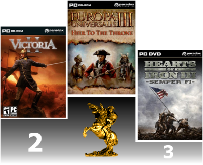 Aujourd'hui, nous continuons notre tour d'horizon des 10 catégories avec l'élection du "Meilleur Jeu de Grande Stratégie". Et c'est un carton plein pour Paradox : 3 jeux développés en interne parmi les nominés et 3 jeux récompensés. Départager ces trois monstres vous a posé de nombreux problèmes mais c'est finalement l'age qui a primé : Europa Universalis 3, pourtant le plus ancien, a assez facilement dominé ses cadets. Il faut dire qu'avec 3 (et maintenant 4) extensions, il est difficile de trouver plus complet. Derrière, Victoria 2, sorti cette année, fait une entrée fracassante dans le coeur des fans puisque, malgré ses défauts de jeunesse, il termine sur la deuxième marche du podium. Enfin, à la troisième place, HOI 3 : Semper Fi est parvenu à se réconcilier avec son public.
