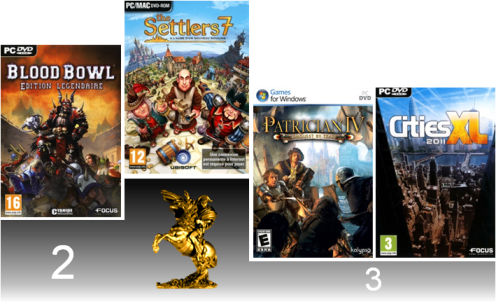 S'il est une catégorie où les votes ont été serrés, c'est bien l'élection du "Meilleur Jeu de gestion 2010". Pour vous dire, nous avons été obligé d'agrandir notre podium pour permettre d'accueillir non pas 3, mais 4 jeux ! En effet, Patrician IV et Cities XL 2011 ont terminé à égalité et terminent à la troisième place. Blood Bowl : Edition Légendaire a également été fortement plébiscité au point qu'il a longtemps menacé le vainqueur mais échoue finalement à la deuxième place, d'un cheveu. A la première place, The Settlers 7 a profité du renouveau de la série, avec un retour aux sources bien vue, pour s'imposer dans une catégorie très tendue. Enfin, Commander : Conquest of the Americas ne démérite pas. Il termine à 3 voix du podium ! Une excellente performance pour le petit studio de Nitro Games.