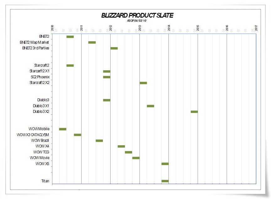 De quoi s'agit-il donc ? Une image qui présente le planning interne de Blizzard sur les années à venir a été posté sur de nombreux sites comme celui-ci par exemple. Cette image indique la date de sortie des jeux Blizzard et donc des futures sorties ! Comme dit plus haut, il est quasi sûr que ce soit un fake, mais jetons un oeil tout de même. Cliquez sur l'image pour la voir en taille réelle.
